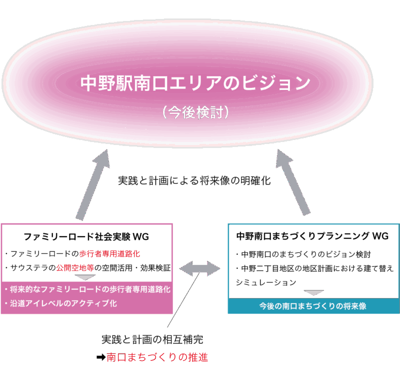 2025年度は、中野駅南口エリアの将来像を検討するための取り組みとして、①中野南口まちづくりプランニングWG、②ファミリーロード社会実験WGの2つのワーキンググループを設置し、活動を行います。