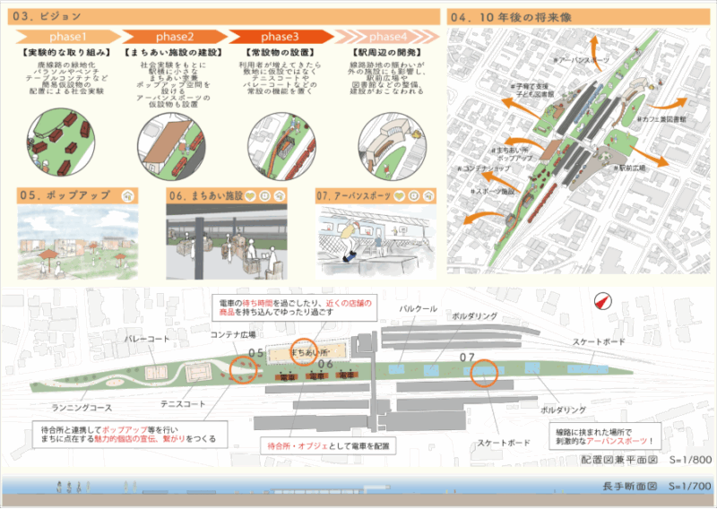 廃路線を緑地化し滞留できる空間の創出、大牟田で積極的に行われているリノベーションと絡めたポップアップ施設の設置、アーバンスポーツ施設や子ども図書館といった多様な人々がそれぞれの居場所や自分を表現できるような空間を創造する案としました。